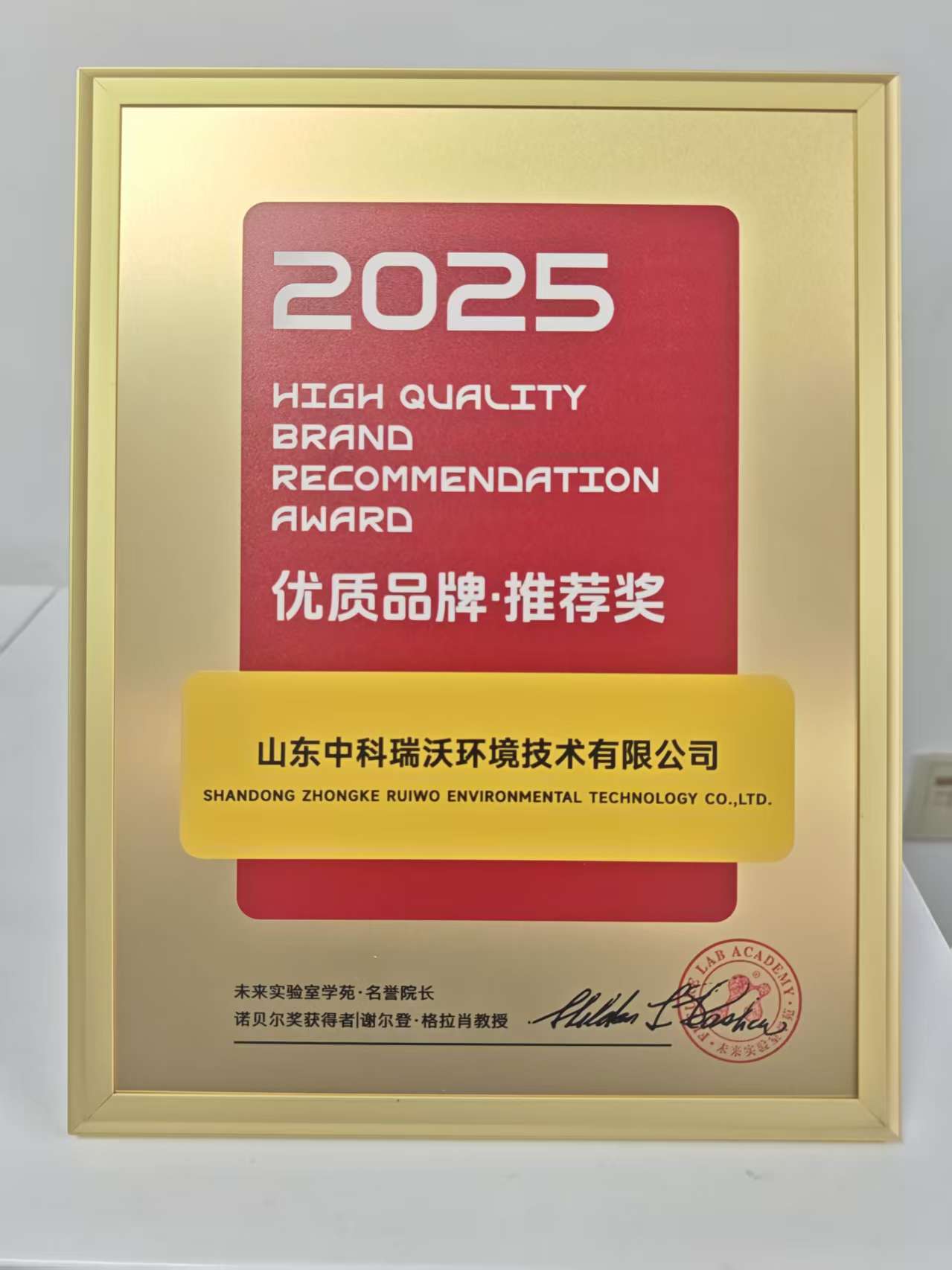 2025年4月10日,山東中科瑞沃環(huán)境技術有限公司在2025未來實驗室創(chuàng)新與發(fā)展大會暨第十屆未來實驗室建設與裝備展覽交易會上,旗下“中科瑞沃”品牌喜獲未來實驗室學苑·名譽院長、諾貝爾獎獲得者:謝爾登·格拉肖教授頒發(fā)的《優(yōu)質品牌推薦獎》。