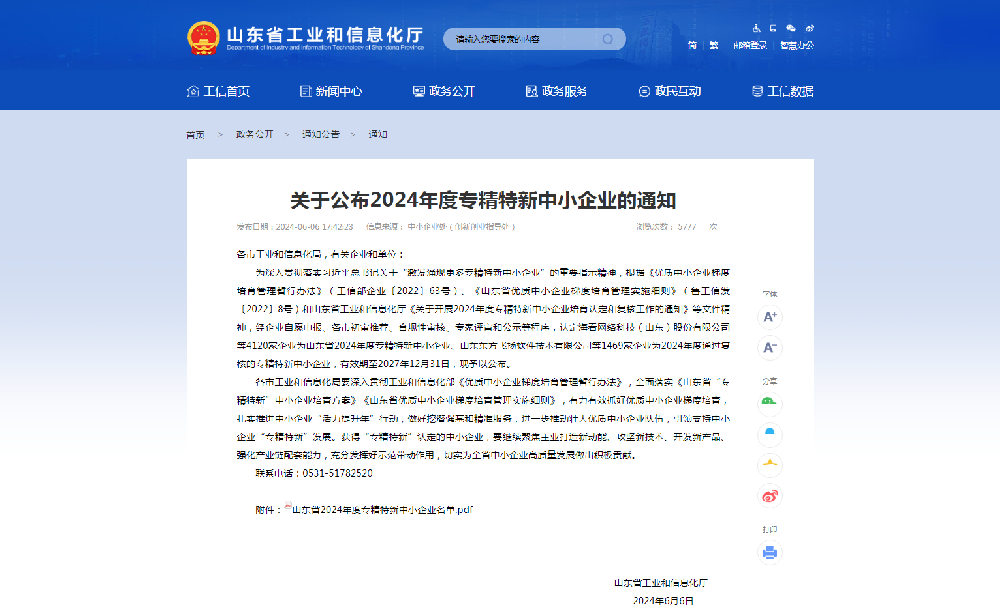 近日,山東省工業(yè)和信息化廳公布了2024年度專精特新中小企業(yè)名單,山東中科瑞沃環(huán)境技術(shù)有限公司成功入選。